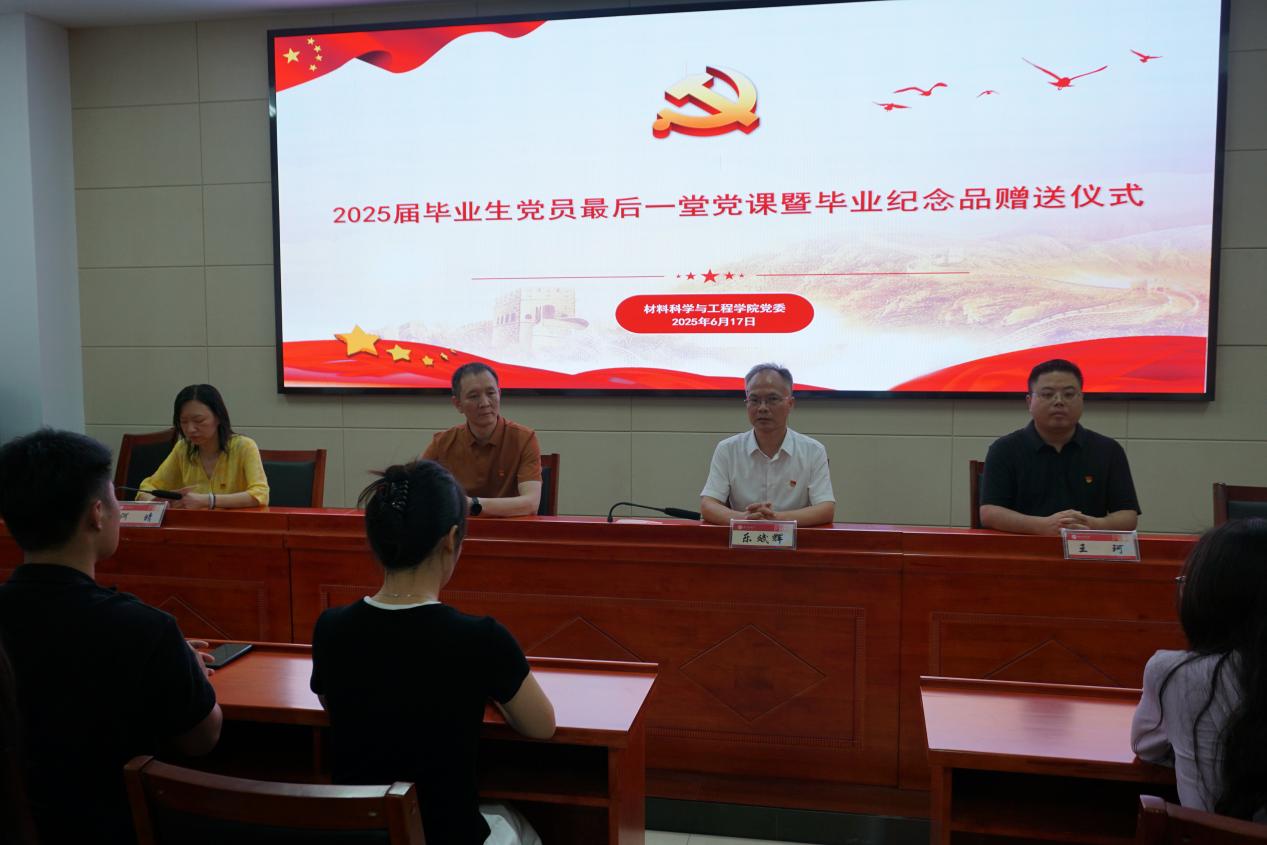 6月17日下午,学院党委在知行楼A144会议室隆重举行2025届毕业生党员最后一堂党课暨毕业纪念品赠送仪式。院党委委员、院长刘清泉、院党委书记乐斌辉、院党委委员何晴、院专职组织员王珂等领导和老师出席,70余名毕业生党员及学生干部代表参加活动。