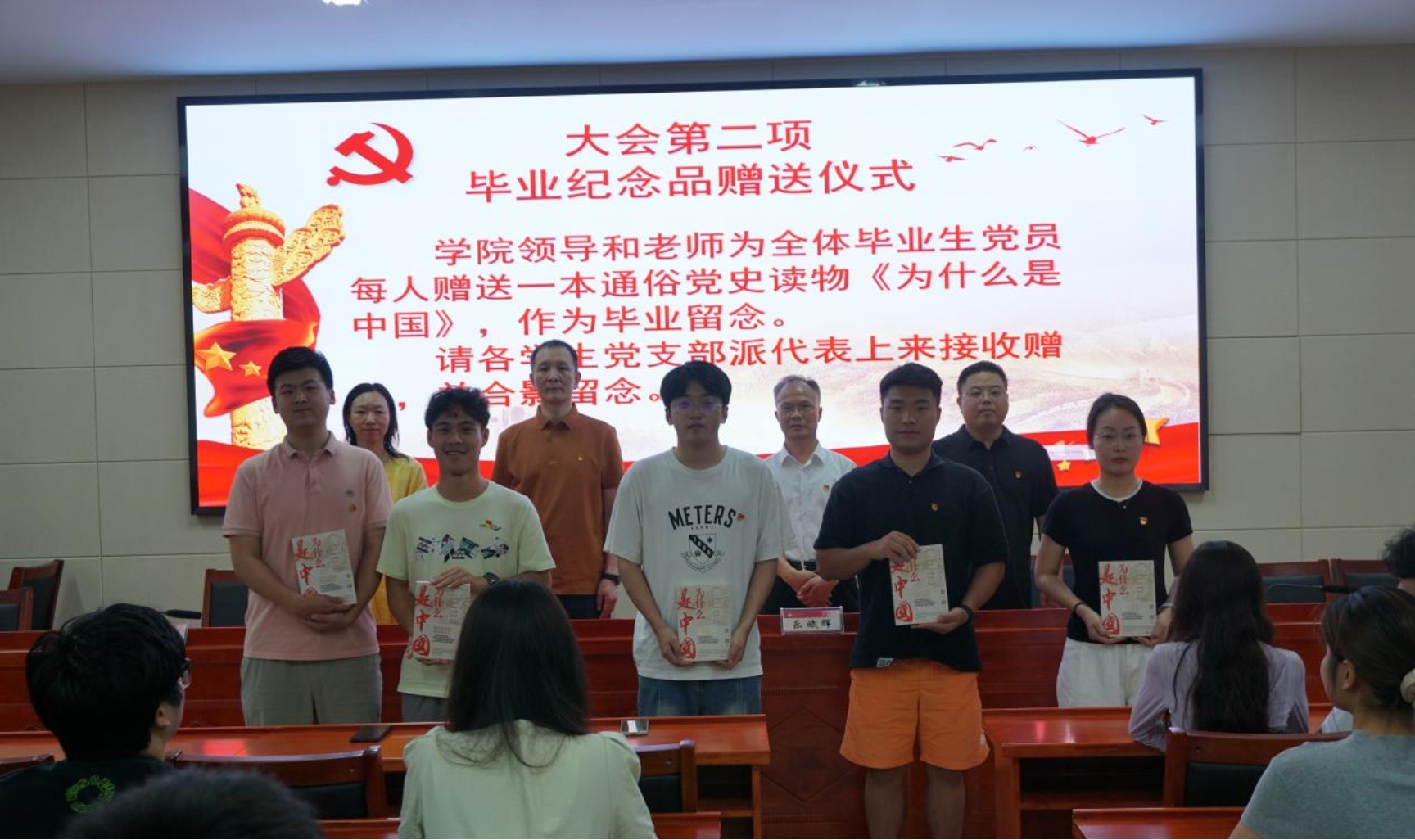 仪式在庄严的国歌声中拉开帷幕。在毕业纪念品赠送环节,学院领导和老师向各支部毕业生党员赠送通俗党史读物《为什么是中国》。这本承载着学院党委关怀与期望的书籍,寓意着毕业生党员将带着对中国道路的思考与自信踏上新征程。