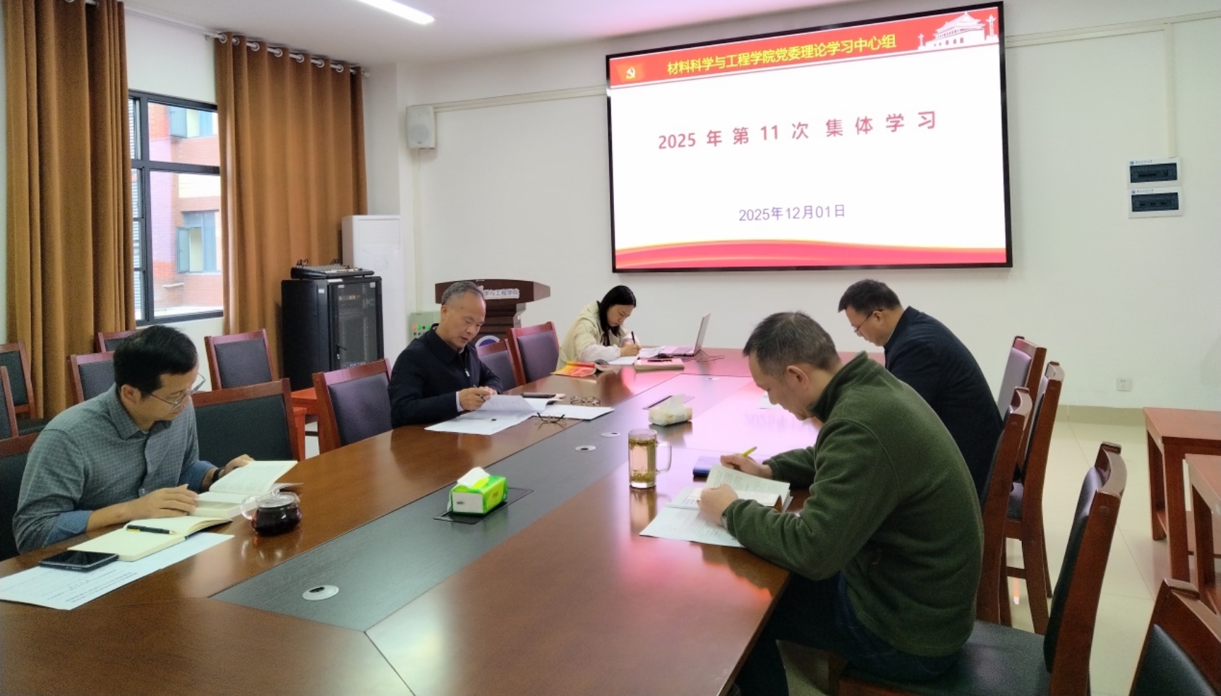 院党委副书记屠波围绕学习主题作了题为《深学笃行全会精神 科学谋划发展蓝图》的中心发言。他提出,要以全会精神为指引,高质量推进学院“十五五”规划编制工作:一要明确发展定位,突出材料学科特色优势;二要凝练重点方向,强化有组织科研;三要深化人才培养改革,提升育人质量;四要加强治理体系建设,激发办学活力。他强调,规划编制要坚持问计于师生、问需于发展,使规划真正成为引领学院未来五年高质量发展的行动纲领。