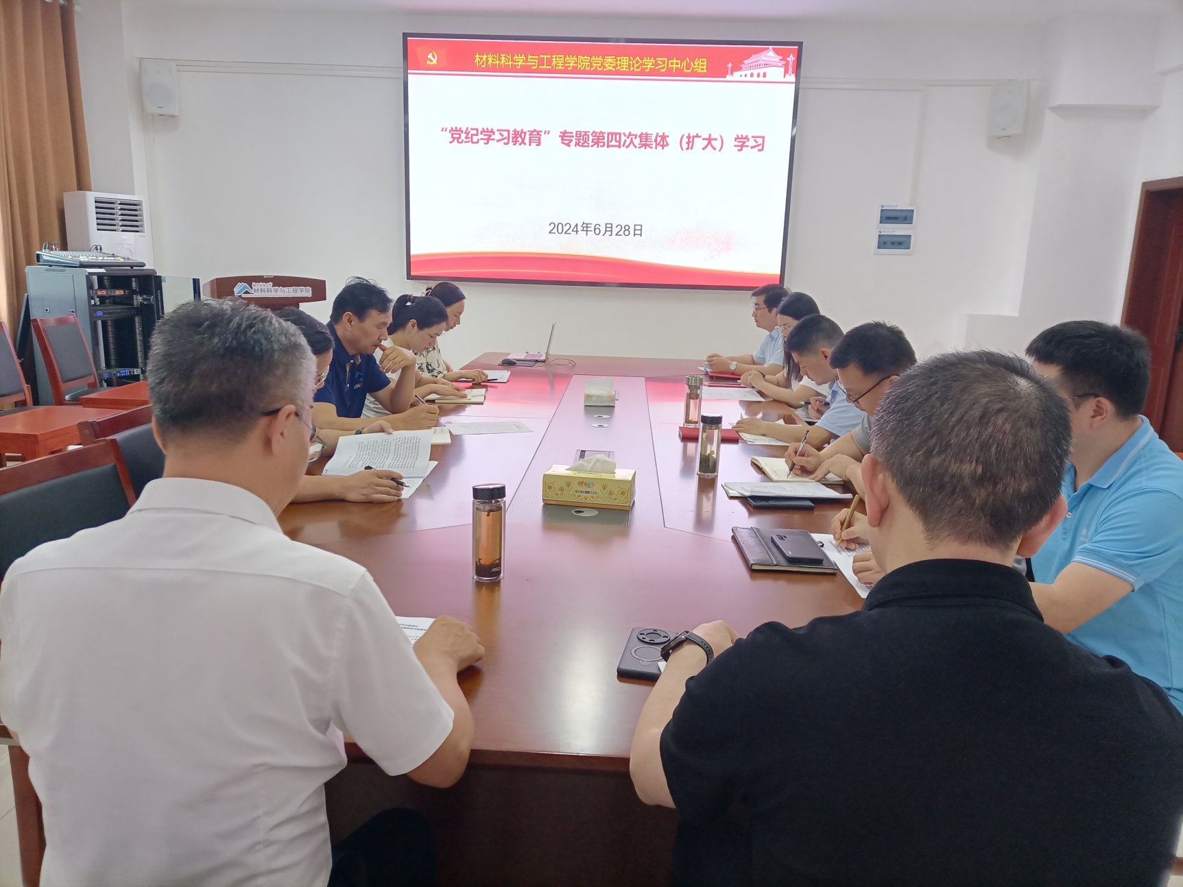 6月28日下午,院党委理论学习中心组在知行楼A140会议室举行“党纪学习教育”专题第四次集体(扩大)学习,深入学习贯彻习近平总书记关于全面加强党的纪律建设的重要论述精神,拓展深化以案说德、以案说纪、以案说法、以案说责。院党委书记乐斌辉主持学习并作中心发言,全体院党委委员、院领导,党政办、教务办、学工办主任,各党支部书记参加学习。