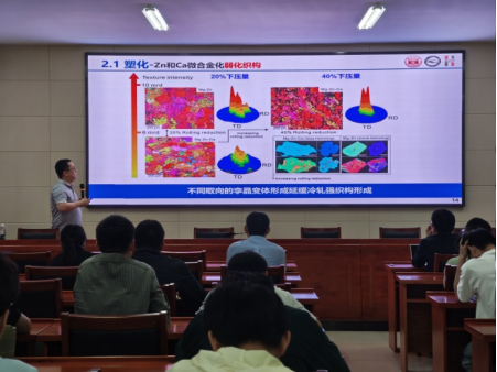 报告伊始,曾卓然教授深入剖析了镁合金材料在性能方面存在的不足,随后详细分享了其团队在镁合金塑化、强化和耐蚀性研究领域所取得的主要成果。此外,他还对镁合金材料研究的未来发展趋势进行了展望。在交流互动环节,他同与会人员就实验研究细节、相关机理等问题展开了深入而热烈的探讨,为在场师生答疑解惑,启发思维。