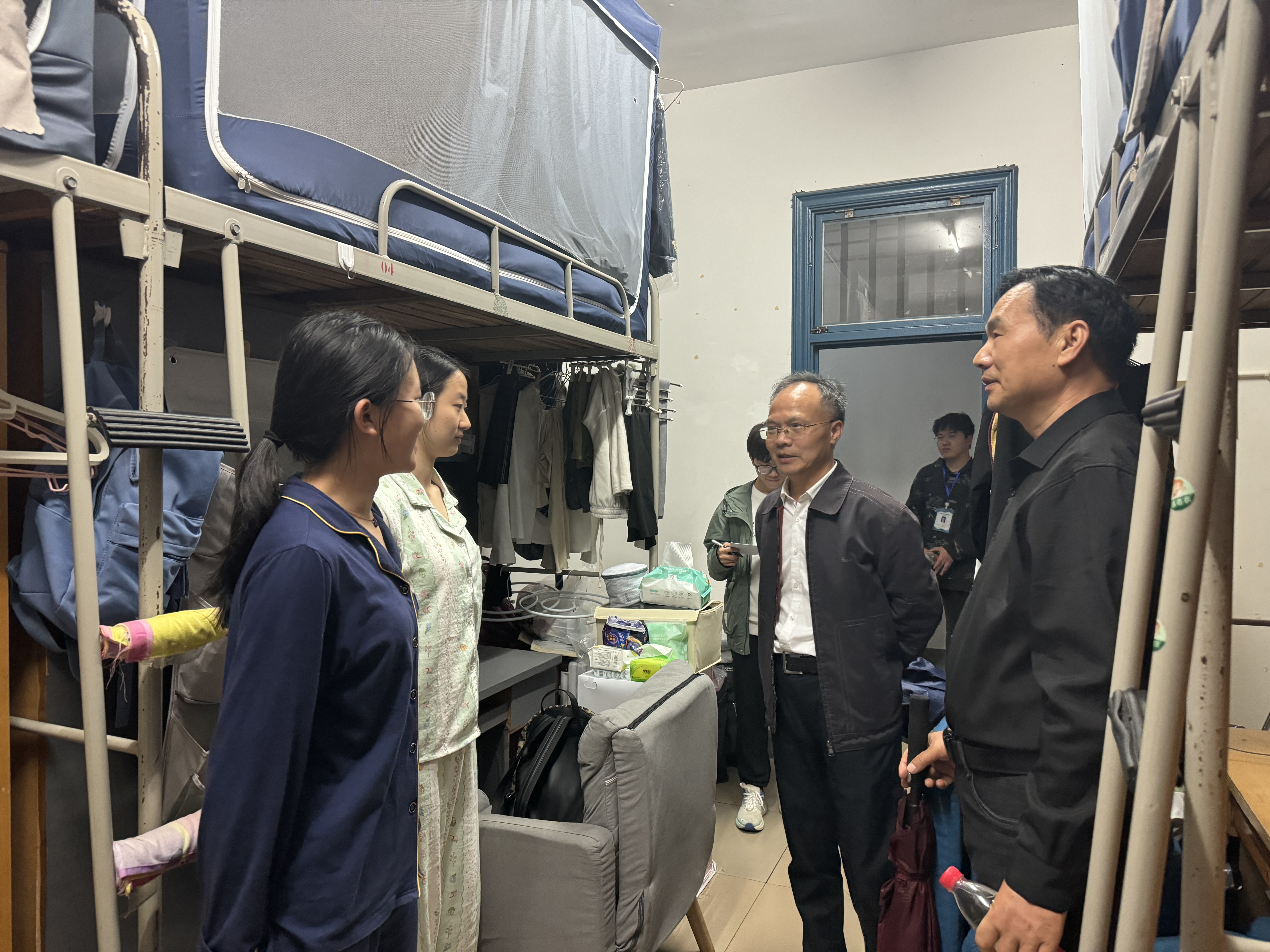 乐斌辉与学生亲切交谈,深入了解学生在校学习、生活情况,鼓励学生树立远大理想和抱负。他说:“宿舍是学生在校生活的重要场所,一个安全、整洁的宿舍环境对学生的身心健康至关重要,希望你们能够提升宿舍安全意识,加强自我管理,共同营造一个安全和谐的学习生活环境。”