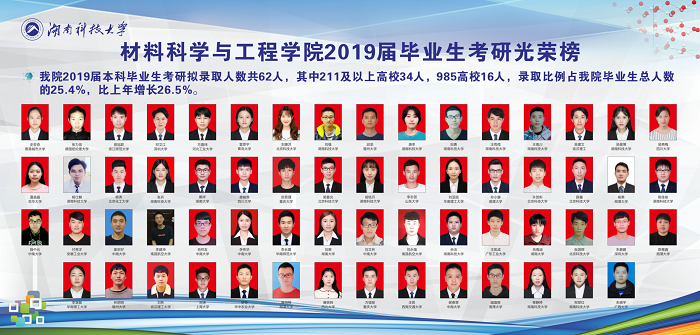 近日,2019届大学生考研录取工作接近尾声,我院2019届本科毕业生考研录取情况喜人,多个班级传来好消息:15级材料化学1班考研录取率达43%,15级金属材料工程1班考研录取率达33%,应届毕业生共有62人被国内外各高校录取,其中211及以上高校34人,985高校16人,录取率达25.4%,同比上年增长26.5%;2018届同期的增长率为27.9%。